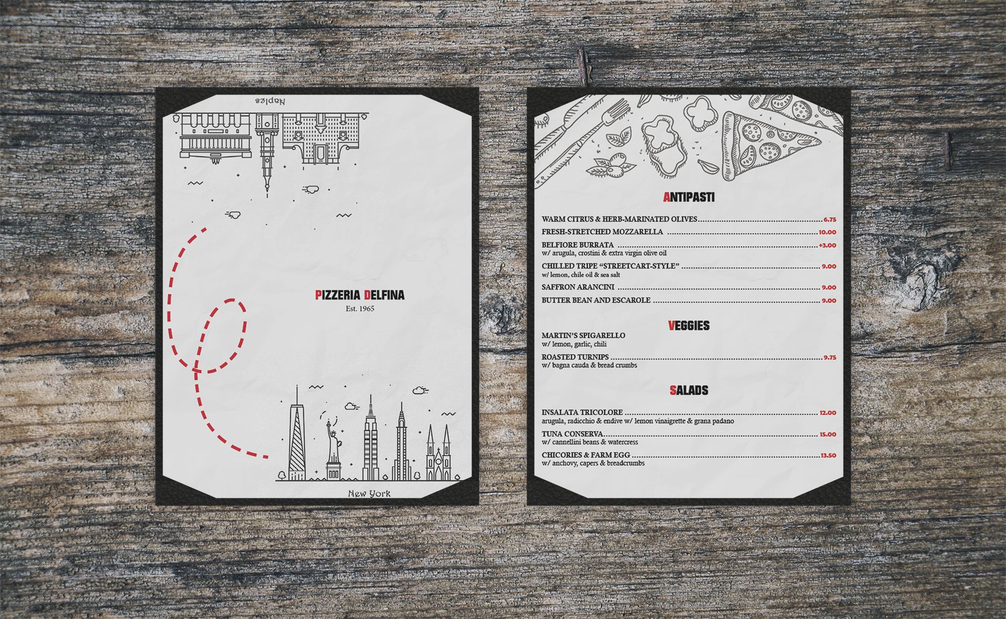 I did this menu for a pizza place that cooked pizza in the original Naples style in Italy. Even though I didn’t make the illustrations on the menu, I tried to match the style of the images to unify the look of it. I also tried to make it easy for the client to find the information they need.