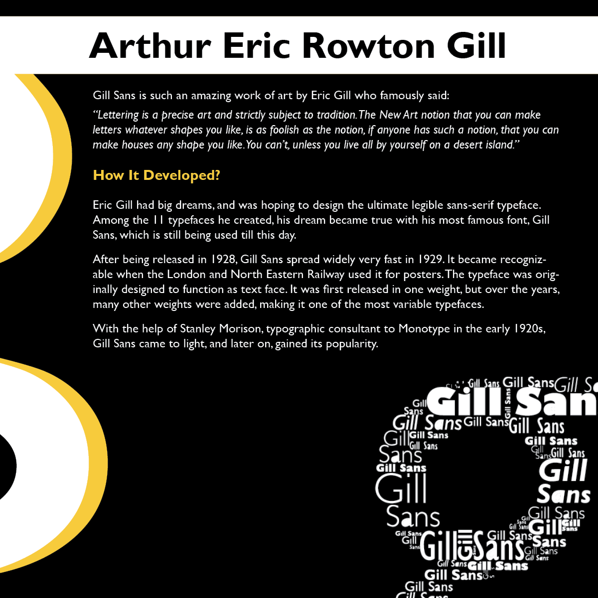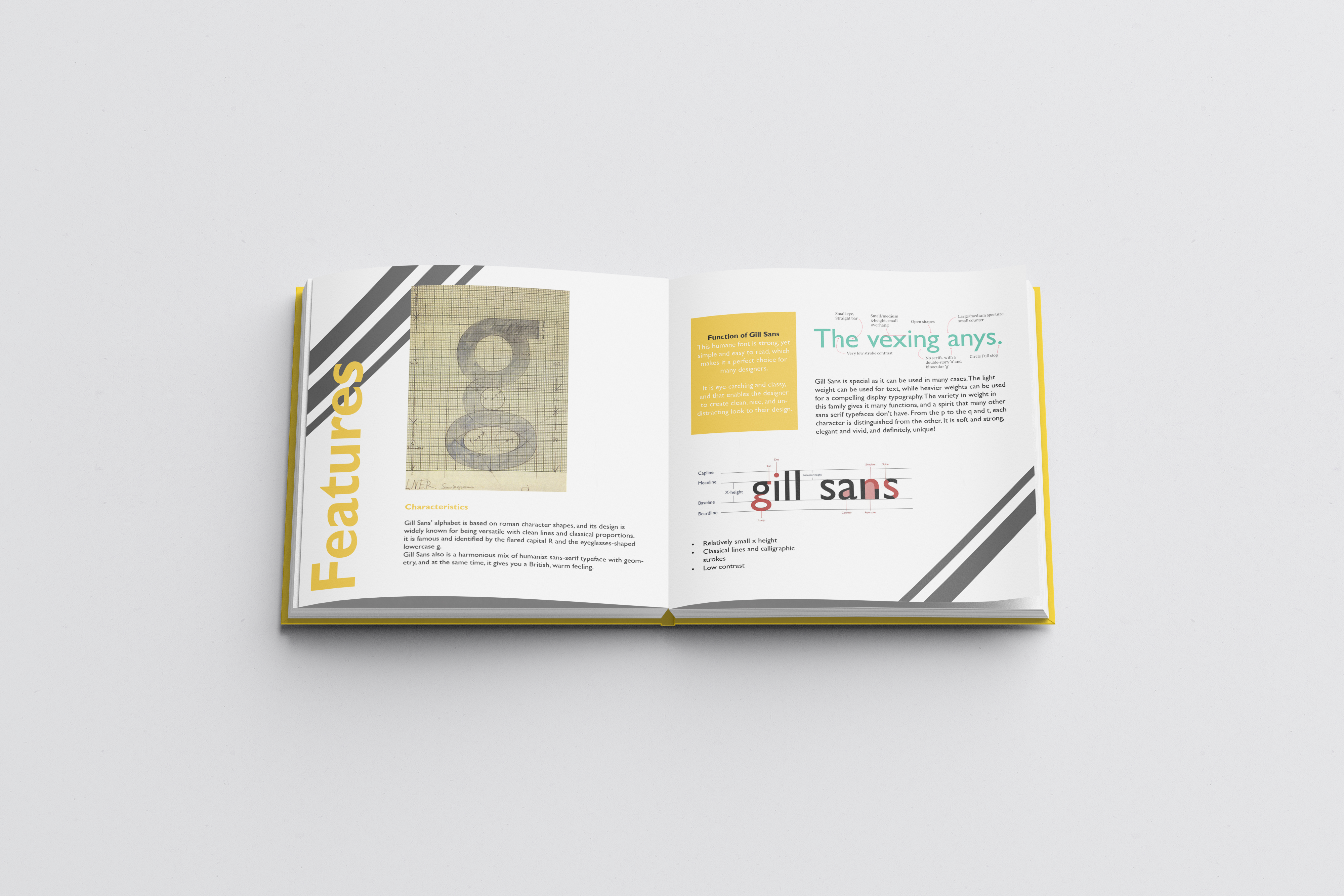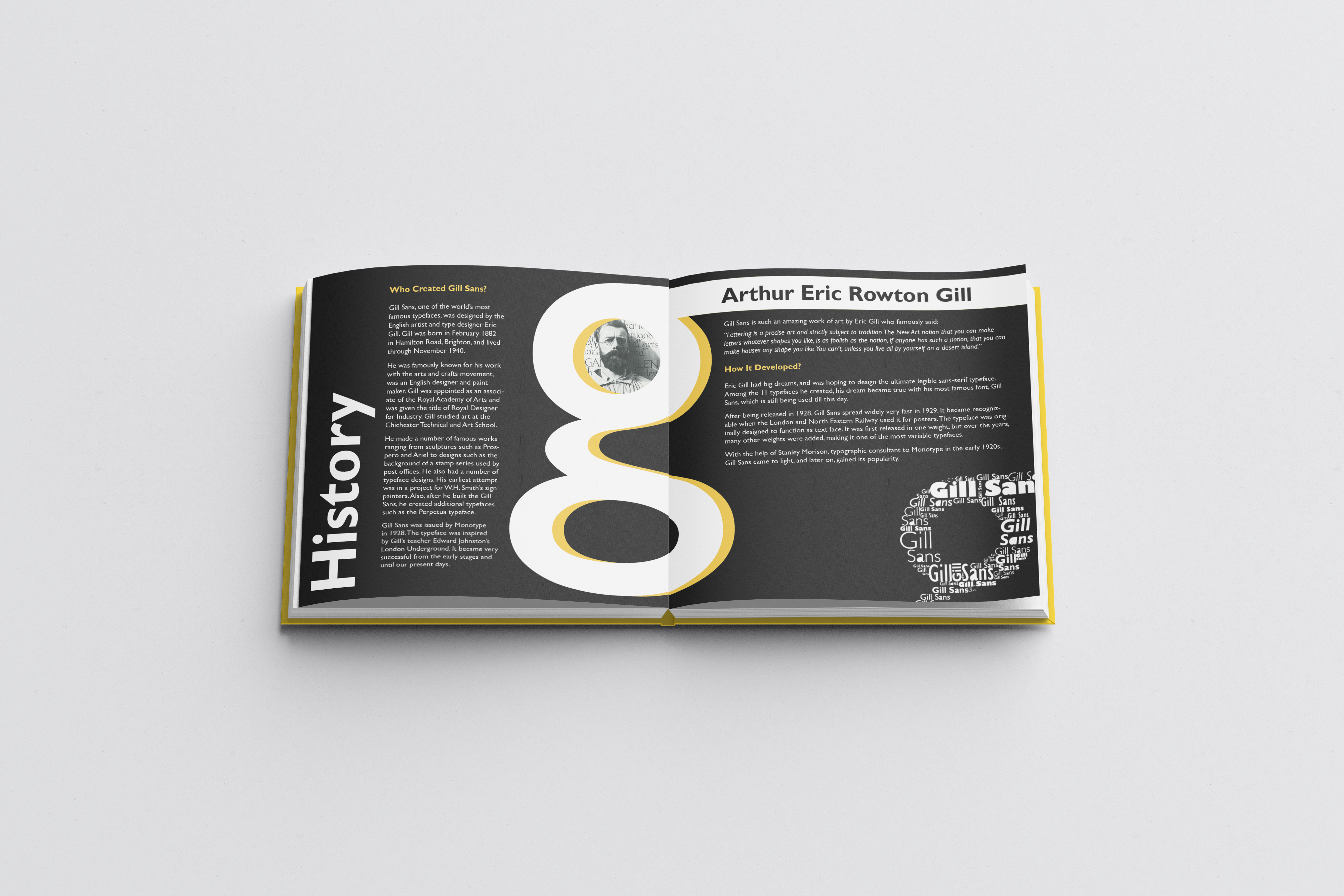 This specimen book is about gill sans typeface, with all its verities and sizes. I tried to have fun designing the pages and making them eye-catching to encourage the reader to keep flipping through the book.
